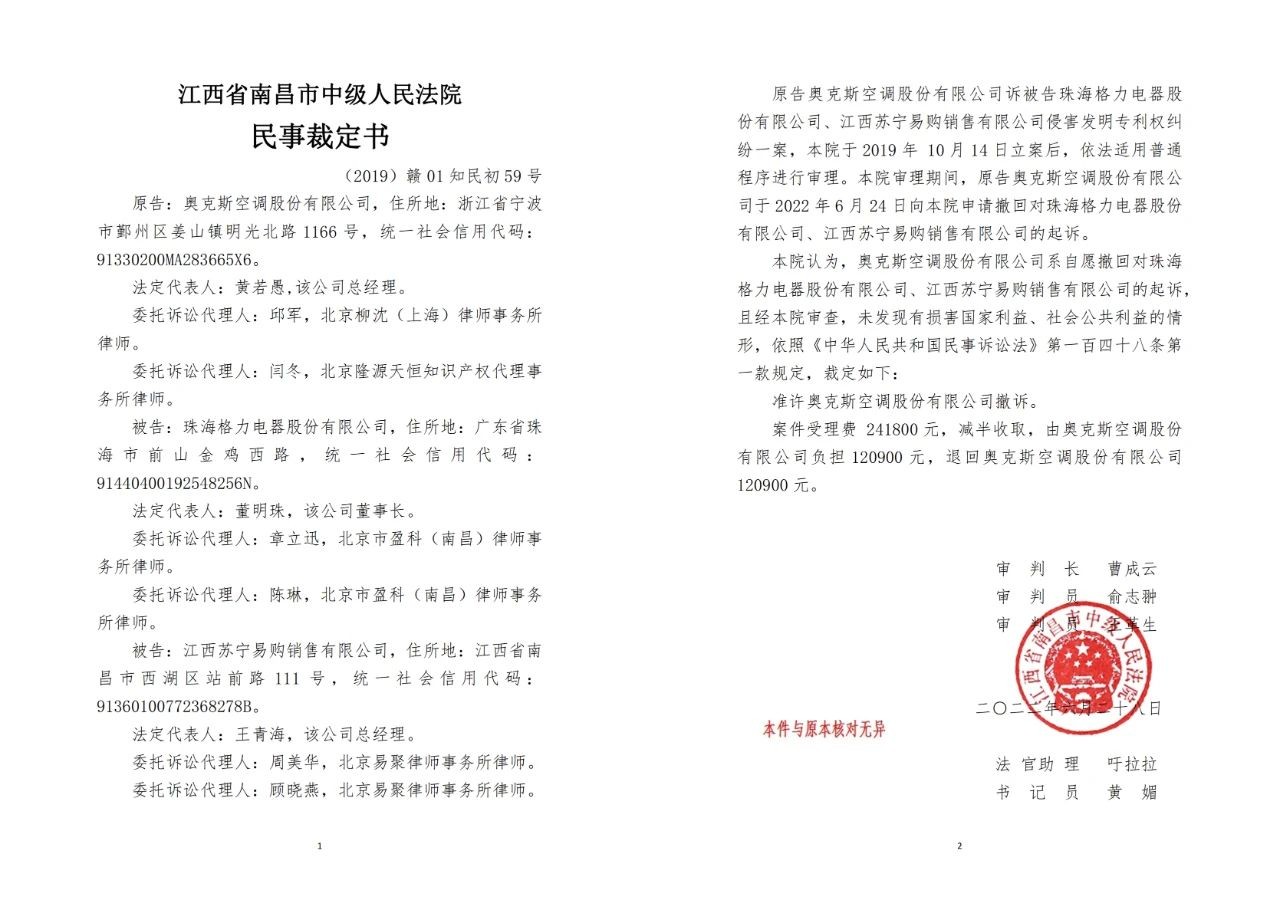 江西省南昌市中級(jí)人民法院認(rèn)為,奧克斯空調(diào)股份有限公司系自愿撤回對(duì)珠海格力電器股份有限公司、江西蘇寧易購(gòu)銷售有限公司的起訴,且經(jīng)審查,未發(fā)現(xiàn)有損害國(guó)家利益、社會(huì)公共利益的情形,依照《中華人民共和國(guó)民事訴訟法》第一百四十八條第一款規(guī)定,裁定如下: