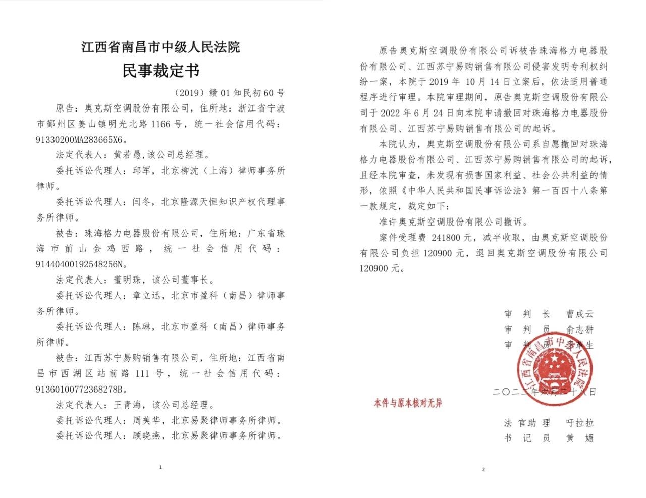據(jù)兩件民事裁定書(shū)顯示,原告奧克斯空調(diào)股份有限公司訴被告珠海格力電器股份有限公司、江西蘇寧易購(gòu)銷售有限公司侵害發(fā)明專利權(quán)糾紛一案,江西省南昌市中級(jí)人民法院于 2019 年 10 月 14 日立案后,依法適用普通程序進(jìn)行審理。審理期間,原告奧克斯空調(diào)股份有限公司于 2022 年 6 月 24 日向江西省南昌市中級(jí)人民法院申請(qǐng)撤回對(duì)珠海格力電器股份有限公司、江西蘇寧易購(gòu)銷售有限公司的起訴。