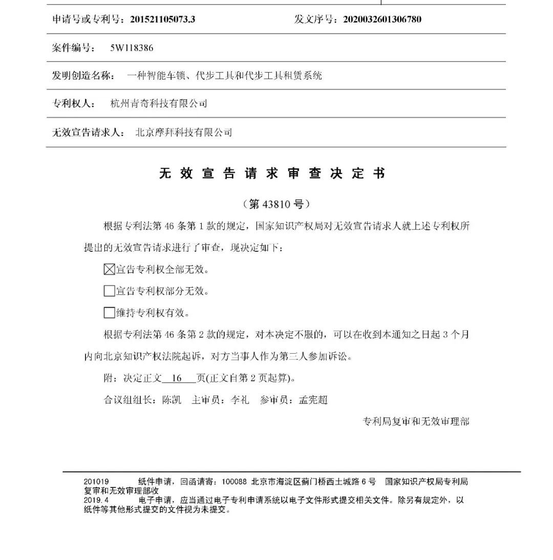 3月31日,由三聚陽光代理的北京摩拜科技有限公司與杭州青奇科技有限公司(青桔單車)的一場專利無效宣告案勝利結(jié)案。在國家知識產(chǎn)權(quán)局作出的第43810號無效審查決定中,專利權(quán)人青奇科技擁有的專利號為201521105073.3 的”一種智能車鎖、代步工具和代步工具租賃系統(tǒng)“專利,專利權(quán)被宣告全部無效。此案中,三聚陽光代理方為請求人摩拜公司。