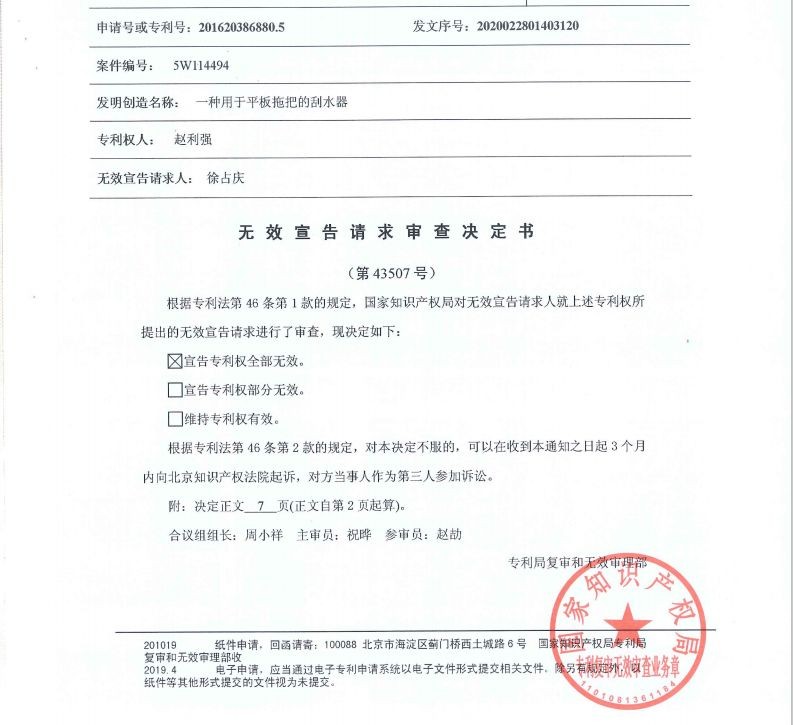日前,由三聚陽光代理的一項專利無效宣告案勝利結(jié)案。在國家知識產(chǎn)權(quán)局作出的第43507號無效審查決定中,專利權(quán)人趙利強先生擁有的專利號為201620386880.5 的”一種用于平板拖把的刮水器“專利,專利權(quán)被宣告全部無效。此案中,三聚陽光代理方為請求人徐占慶先生。