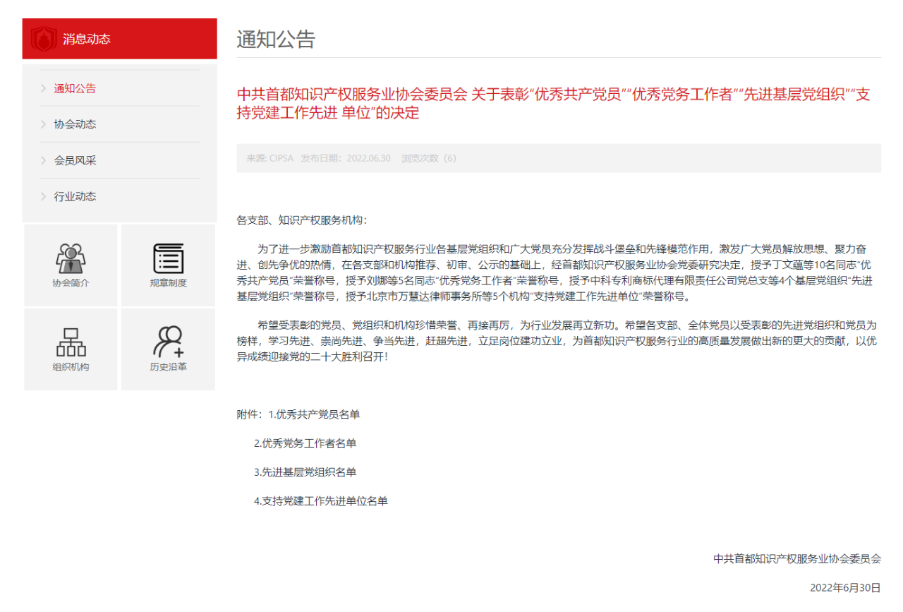 6月30日,中共首都知識產(chǎn)權(quán)服務(wù)業(yè)協(xié)會委員會下發(fā)表彰決定,授予北京三聚陽光知識產(chǎn)權(quán)代理有限公司黨支部“先進(jìn)基層黨組織”榮譽(yù)稱號,同時(shí)授予北京三聚陽光知識產(chǎn)權(quán)服務(wù)集團(tuán)咨詢業(yè)務(wù)總監(jiān)羅嘯“優(yōu)秀共產(chǎn)黨員”榮譽(yù)稱號。