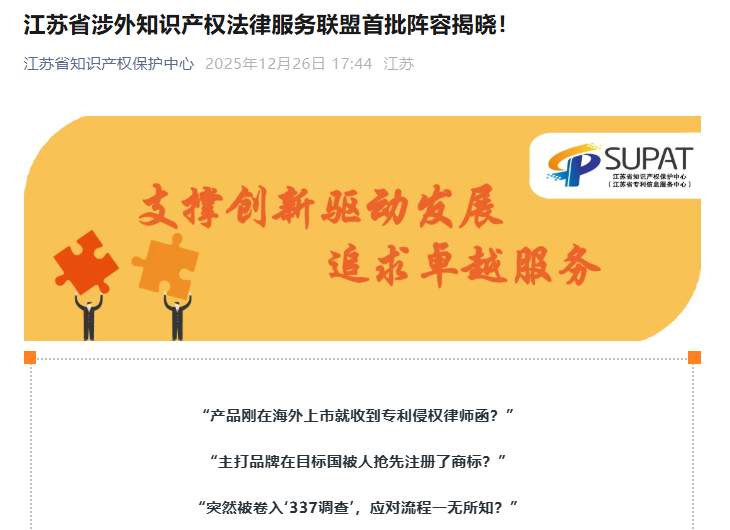 近日,三聚陽光正式加入江蘇省涉外知識產(chǎn)權(quán)法律服務聯(lián)盟。該聯(lián)盟面向江蘇企業(yè)