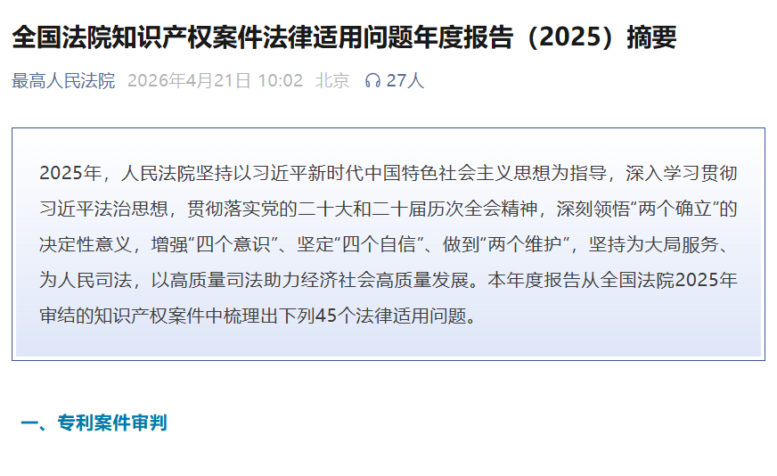 4月21日,最高人民法院發(fā)布《全國(guó)法院知識(shí)產(chǎn)權(quán)案件法律適用問題年度報(bào)告(2025)摘要》,三聚陽(yáng)光代理的“組合專利拆分銷售的‘默示許可’適用案”入選。這是該案繼入選上海知識(shí)產(chǎn)權(quán)研究所“2025年中國(guó)十大最具研究?jī)r(jià)值知識(shí)產(chǎn)權(quán)裁判案例”后,再次獲得國(guó)家級(jí)官方司法案例認(rèn)可。