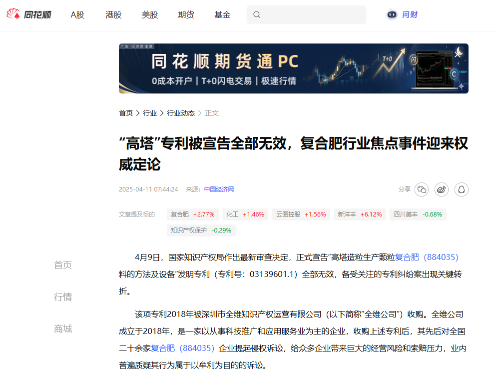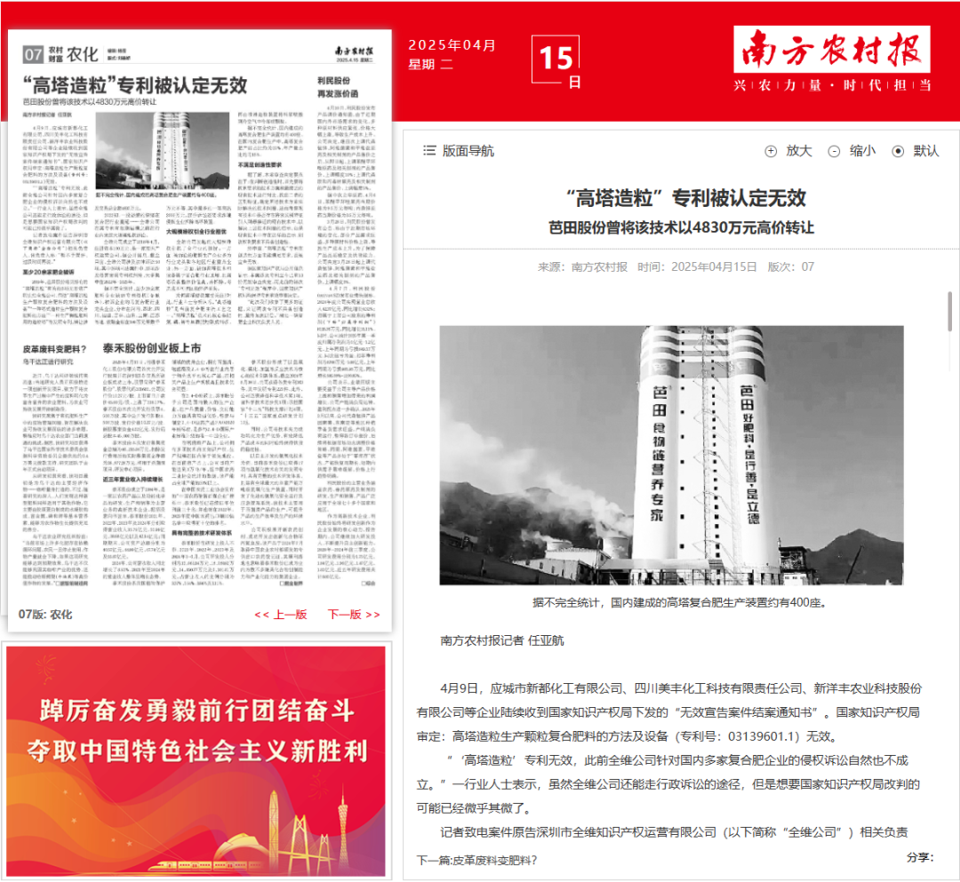 這起案件之所以具有代表性,一個重要原因在于它回應了復合肥行業(yè)長期受到關(guān)注的“問題專利”治理難題。北京知識產(chǎn)權(quán)法院在年度案例中明確指出,高塔造粒是復合肥生產(chǎn)的主流工藝,國內(nèi)相關(guān)裝置數(shù)量眾多。涉案專利在被受讓后,曾被用于針對多家復合肥生產(chǎn)企業(yè)提起批量侵權(quán)訴訟,給企業(yè)正常經(jīng)營和行業(yè)預期帶來較大影響。該案最終推動涉案專利被宣告全部無效,相關(guān)訴訟亦因權(quán)利基礎(chǔ)喪失而終結(jié),從根本上消除了行業(yè)層面的侵權(quán)風險。