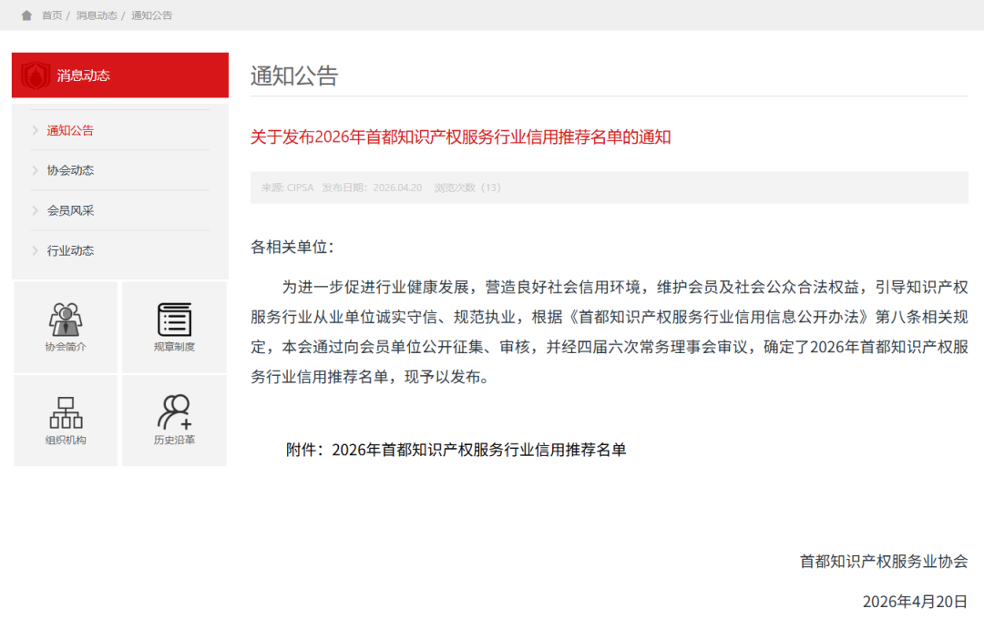首都知識產(chǎn)權(quán)服務業(yè)協(xié)會在組織開展2026年行業(yè)信用推薦工作時明確提出,信用推薦旨在進一步促進行業(yè)健康發(fā)展,引導知識產(chǎn)權(quán)服務行業(yè)從業(yè)單位誠實守信、規(guī)范執(zhí)業(yè)、提升服務質(zhì)量,營造良好社會信用環(huán)境。其申報條件也聚焦于規(guī)范經(jīng)營、信用記錄、行業(yè)自律和持續(xù)服務能力等方面。此次名單的發(fā)布,對于維護社會公眾合法權(quán)益、強化行業(yè)信用導向、推動知識產(chǎn)權(quán)服務業(yè)高質(zhì)量發(fā)展,具有積極意義。