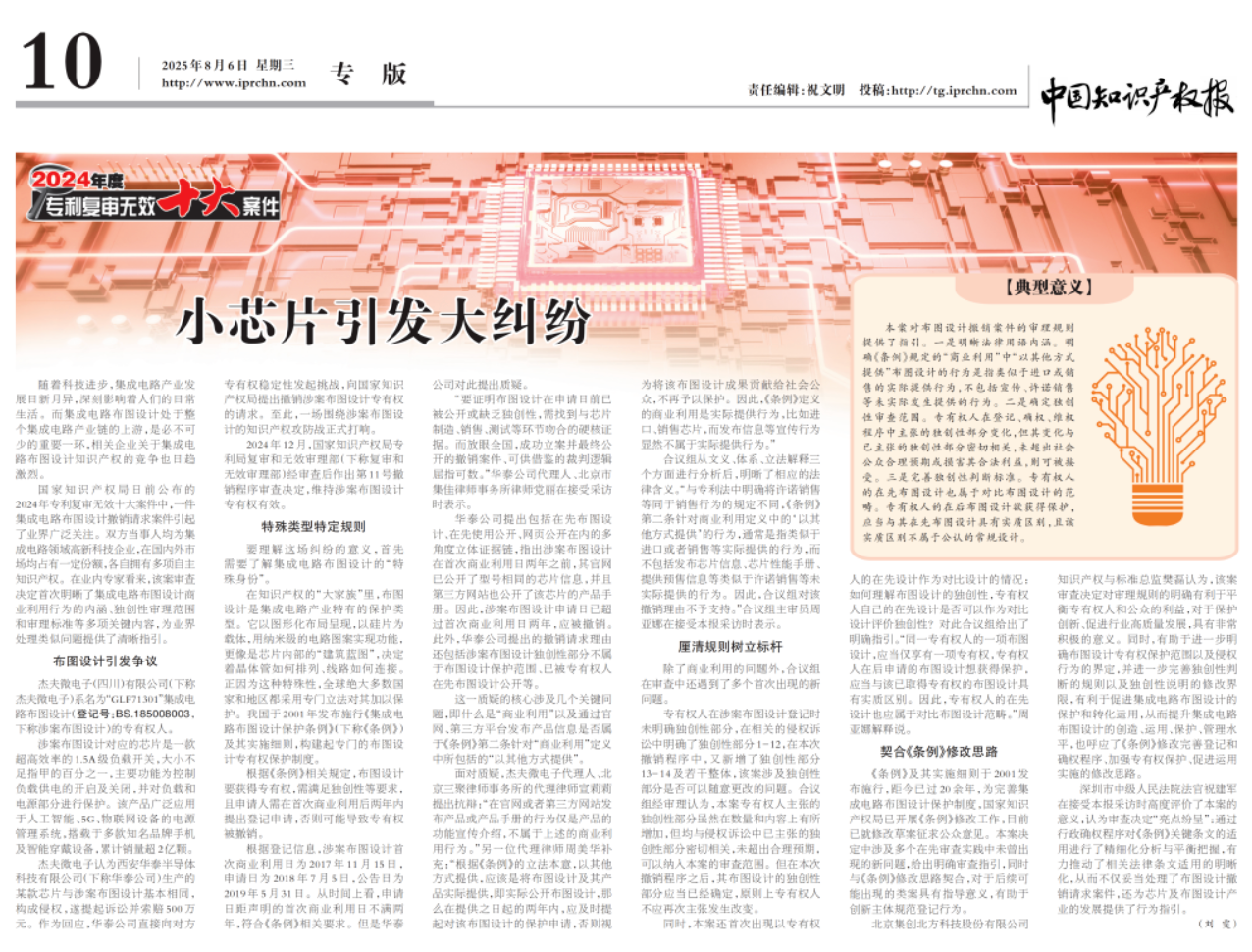 該案入選國家知識產權局2024年度專利復審無效十大案件。同時,作為《集成電路布圖設計保護條例》實施以來的第 11 號撤銷決定,該案厘清了法律適用難題,確立了重要的裁判標準,為我國集成電路布圖設計保護制度的完善和司法實踐的發(fā)展提供了關鍵的推動力。