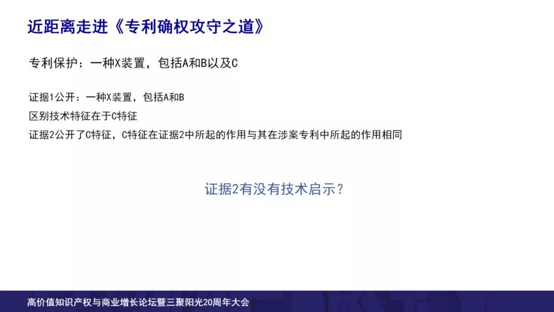 我們問一個問題,證據 2 有沒有技術啟示?我們從一個發(fā)明人發(fā)明一個技術的時候,真正的出發(fā)點一步一步來看,到底能不能得到一個涉案專利?這里可以看到,不僅僅考慮三個最重要的要素,我們還要考慮很多輔助的元素。我們考慮“某一個技術結合現有技術的時候,它能不能結合?結合以后能不能得到涉案專利?”這些問題的時候我們不可避免的要考慮這些輔助因素,包括技術領域、適用場景、結合障礙還包括大家對于技術的認識水平。所以技術啟示的判斷問題就希望做到這一點,能夠讓大家更好認識發(fā)明創(chuàng)造的過程。