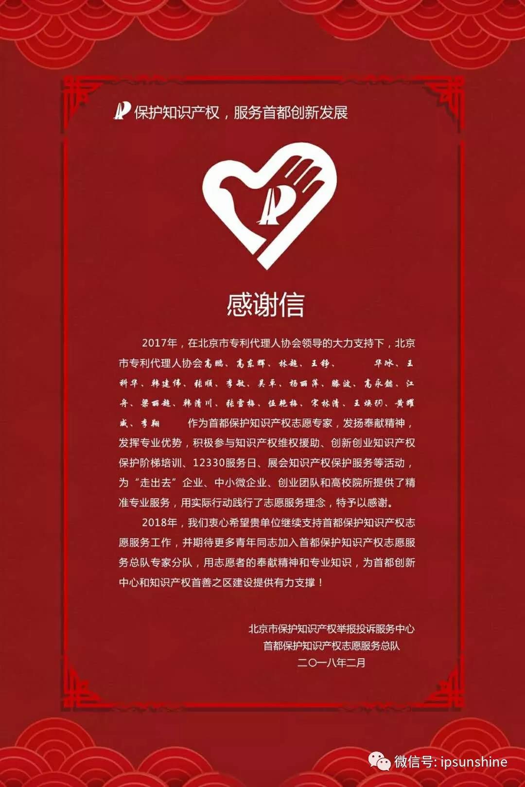 日前,北京市保護(hù)知識(shí)產(chǎn)權(quán)舉報(bào)投訴服務(wù)中心、首都保護(hù)知識(shí)產(chǎn)權(quán)志愿服務(wù)總隊(duì)發(fā)出感謝信,對(duì)在2017年積極參與知識(shí)產(chǎn)權(quán)維權(quán)援助、創(chuàng)新創(chuàng)業(yè)知識(shí)產(chǎn)權(quán)保護(hù)階梯培訓(xùn)、12330服務(wù)日、展會(huì)知識(shí)產(chǎn)權(quán)保護(hù)服務(wù)等活動(dòng)的22位首都保護(hù)知識(shí)產(chǎn)權(quán)志愿專(zhuān)家表示感謝,其中包括了來(lái)自三聚陽(yáng)光的李敏、高東輝、林超、高鵬等四位志愿專(zhuān)家。