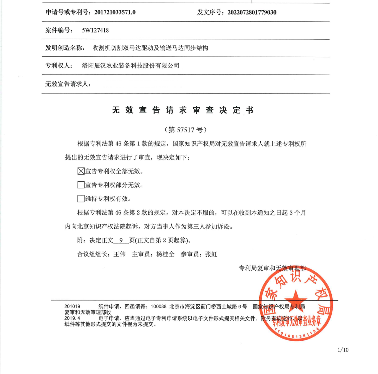 近日,由三聚陽光和北京易聚律師事務(wù)所聯(lián)合代理的農(nóng)機企業(yè)和洛陽辰漢農(nóng)業(yè)裝備科技股份有限公司的專利無效宣告勝利結(jié)案。國家知識產(chǎn)權(quán)局作出第57517號無效審查決定,宣告辰漢農(nóng)業(yè)裝備擁有的第201721033571號“收割機切割雙馬達驅(qū)動及輸送馬達同步結(jié)構(gòu)”專利全部無效。