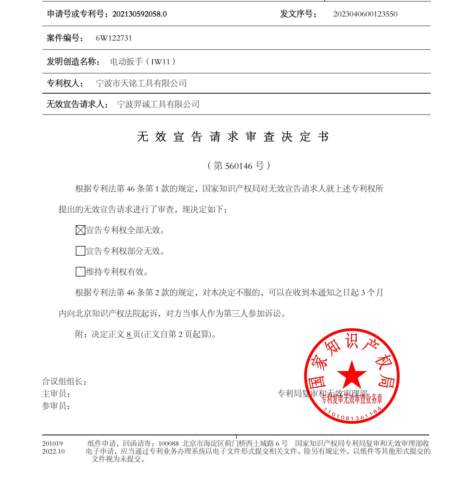 近日,由北京三聚陽(yáng)光知識(shí)產(chǎn)權(quán)代理有限公司和北京易聚律師事務(wù)所聯(lián)合代理寧波羿誠(chéng)工具有限公司的專利無(wú)效宣告結(jié)案。國(guó)家知識(shí)產(chǎn)權(quán)局作出第 560146 號(hào)無(wú)效審查決定,宣告寧波市天銘工具有限公司擁有的第202130592058.0號(hào)“電動(dòng)扳手(IW11)”外觀專利權(quán)全部無(wú)效。