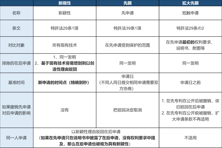 特別要注意,由于以上歷史原因,日本的“抵觸申請”條款不包含同一申請人或同一發(fā)明人的情形,所謂“相同”指代發(fā)明人完全相同或申請人完全相同。如果在先在后提交的兩份相同的申請的發(fā)明人全部相同或申請人全部相同,日本專利局不依據(jù)“擴大先愿”駁回,轉(zhuǎn)而依據(jù)第三十九條「先願」的先申請制度,基于在后申請沒有「新規(guī)性」駁回。駁回的結(jié)果一樣,只是依據(jù)不同。中國則沒有這一例外。