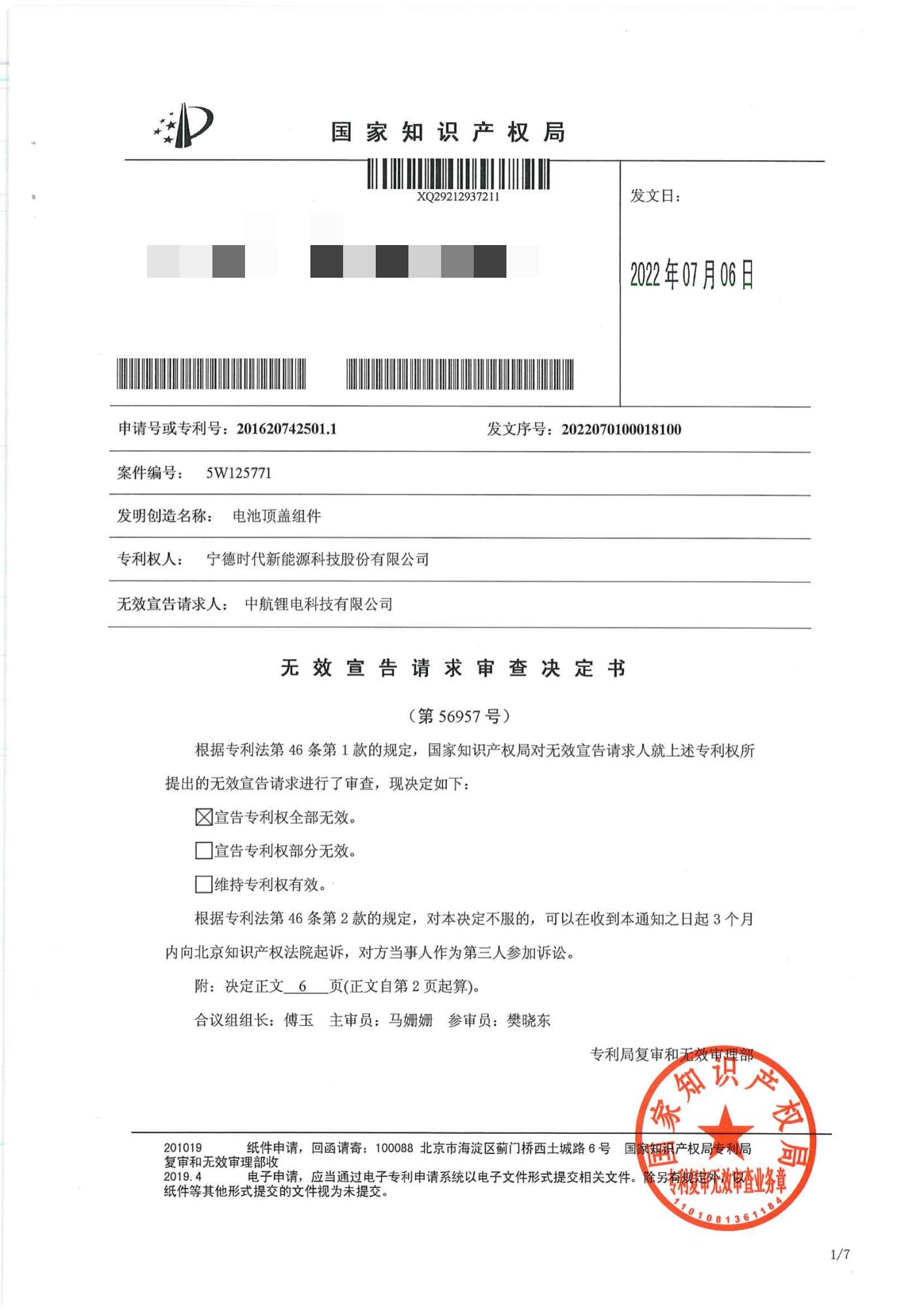 7月6日,國家知識產(chǎn)權(quán)局下發(fā)第56957號無效審查決定,宣告寧德時代新能源科技股份有限公司擁有的第201620742501號“電池頂蓋組件”專利全部無效。本案無效宣告請求人仍為中航鋰電科技有限公司(現(xiàn)名:中創(chuàng)新航科技股份有限公司),代理人還是北京三聚陽光知識產(chǎn)權(quán)代理有限公司和北京易聚律師事務(wù)所。