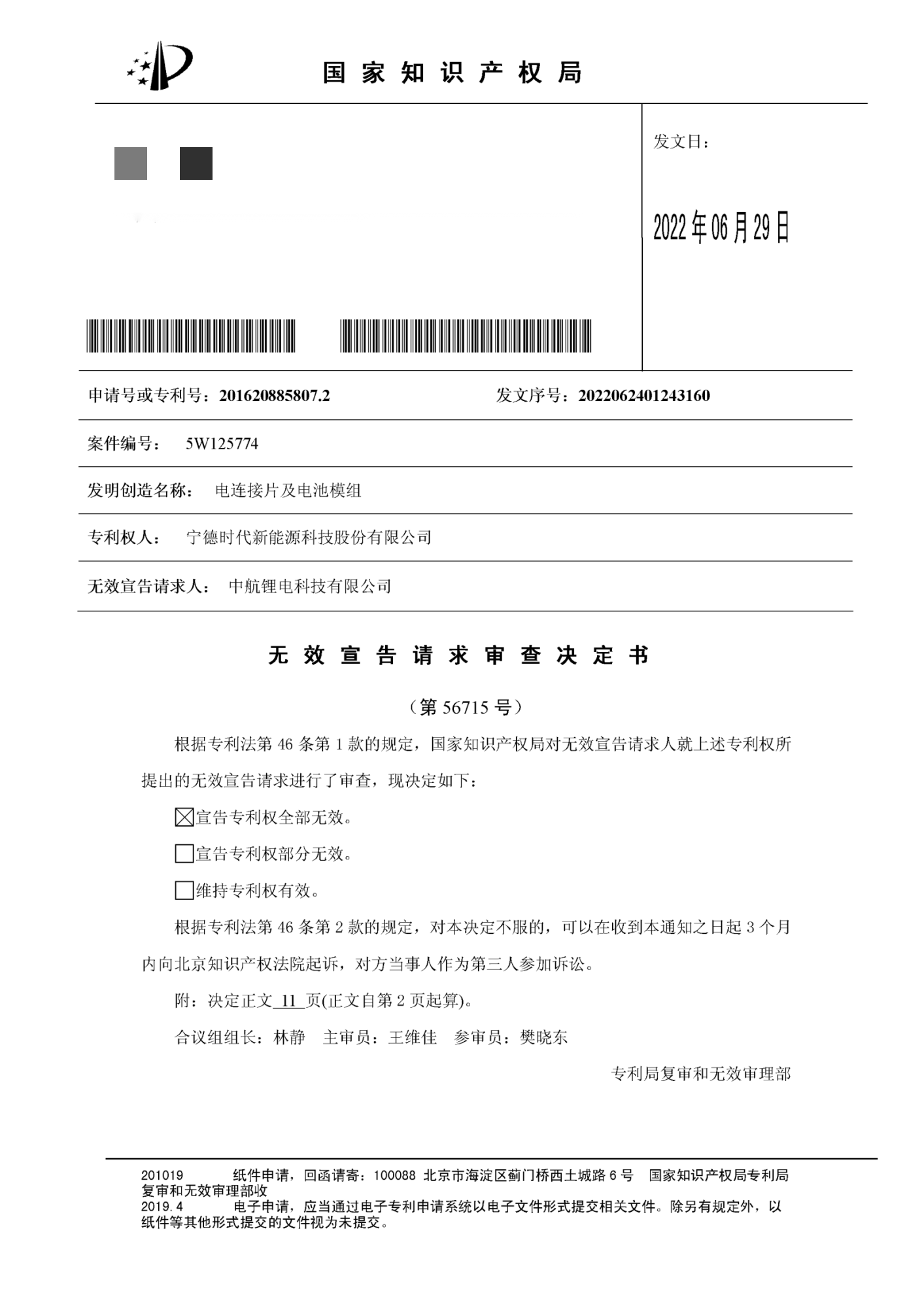 就在7天前的6月29日,國家知識產(chǎn)權(quán)局下發(fā)第56715號無效審查決定,宣告寧德時代新能源科技股份有限公司擁有的第201620885807號“電連接片及電池模組”專利全部無效。